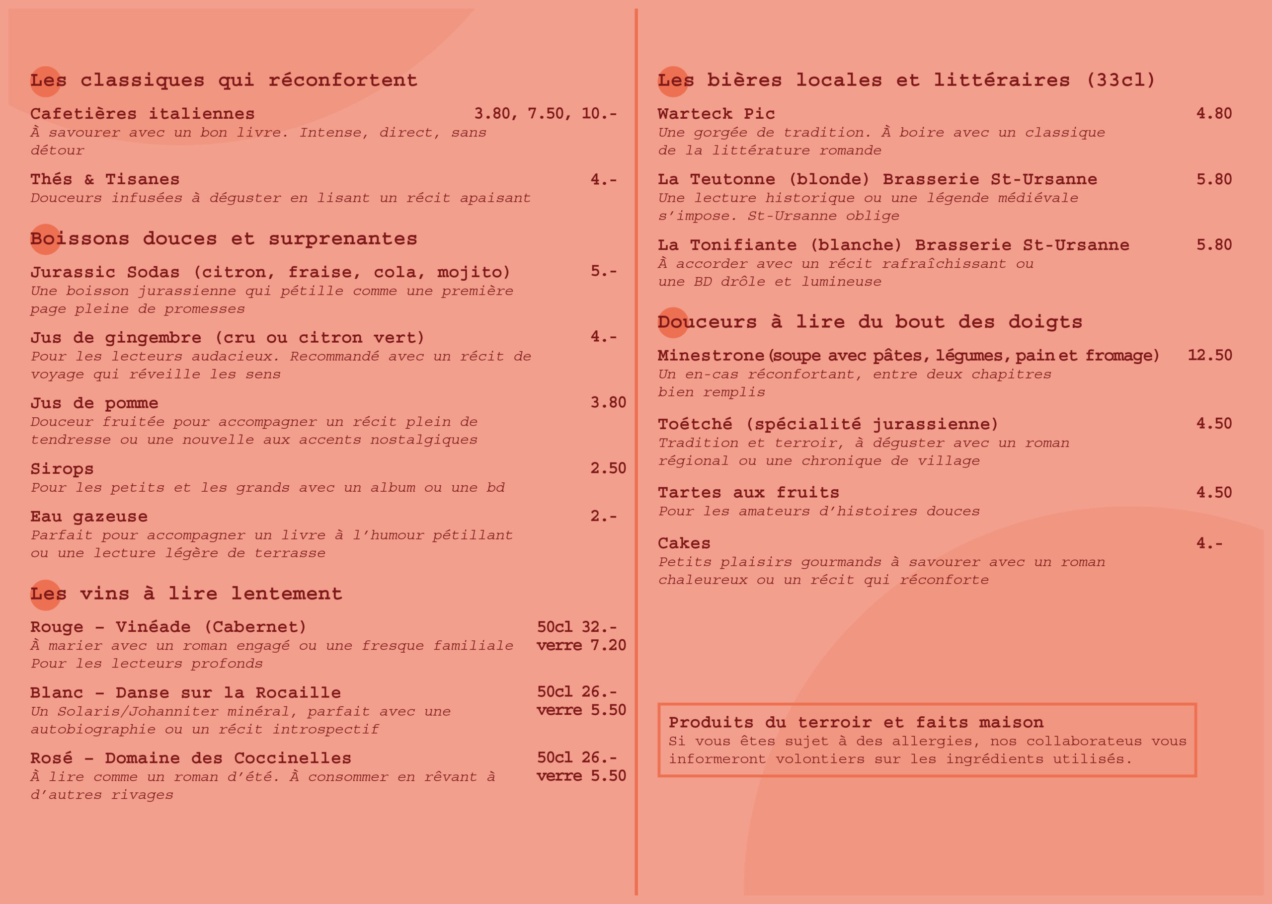 Le café accorde une grande importance à l’origine et à la production des produits qui sont essentiellement locaux et bio. Il s’applique à promouvoir les producteurs régionaux et à favoriser les circuits courts. Les mets proposés sont faits maison. L’amour des bons produits et l’envie de faire plaisir se ressent au travers de la carte avec des prix pour toutes les bourses. Un seul mot d’ordre : le plaisir des papilles, sain et local pour toutes et tous.